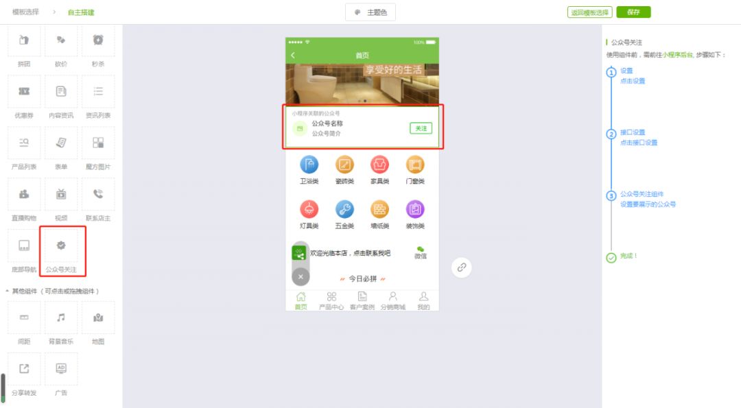 进入小未程序模板后台,小程序页面编辑,将【公众号关注】组件,设置在页面上,用户扫码进入小程序,即可看到展示的公众号,并进行关注。